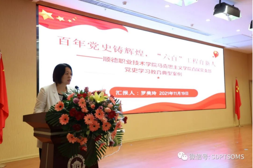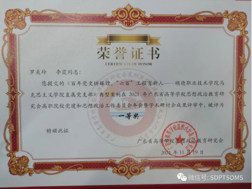2021年11月19日,在广东财贸职业学院召开的广东省高职院校党建和思想政治工作委员会年会暨学术研讨会上,马克思主义学院“百年党史铸辉煌,‘六百’工程育新人——顺德职业技术学院马克思主义学院直属党支部党史学习教育典型案例”获得一等奖,并受邀在会议上作优秀案例分享。