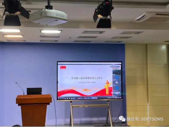 随后,教师代表分享了个人学习感受。广东省高校思政课李霞名师工作室学员、广东职业技术学院马克思主义学院李愿来博士首先就“党史融入思政课课堂”分享了教学体会,提出党史素材选择的五个标准,并以《毛泽东思想和中国特色社会主义理论体系概论》教学中的党史故事为例,解释了党史素材阐释的“科学性、整体性、生动性、参与性、启发性”。广东省高校思政课李霞名师工作室学员、顺德职业技术学院马克思主义学院吴浩然老师也分享了讲好党史故事的心得体会,分别是注重谋篇布局、讲究夹叙夹议和着力共情共鸣,并分别举例说明其原因及效果,为参会者提供了生动参考。顺德职业技术学院马克思主义学院安济森老师对讲话内容、结构进行了深度解读,提炼出讲话中适合用于《毛泽东思想和中国特色社会主义理论体系概论》教学的具体内容,并逐一展示,细致分类、全面覆盖。