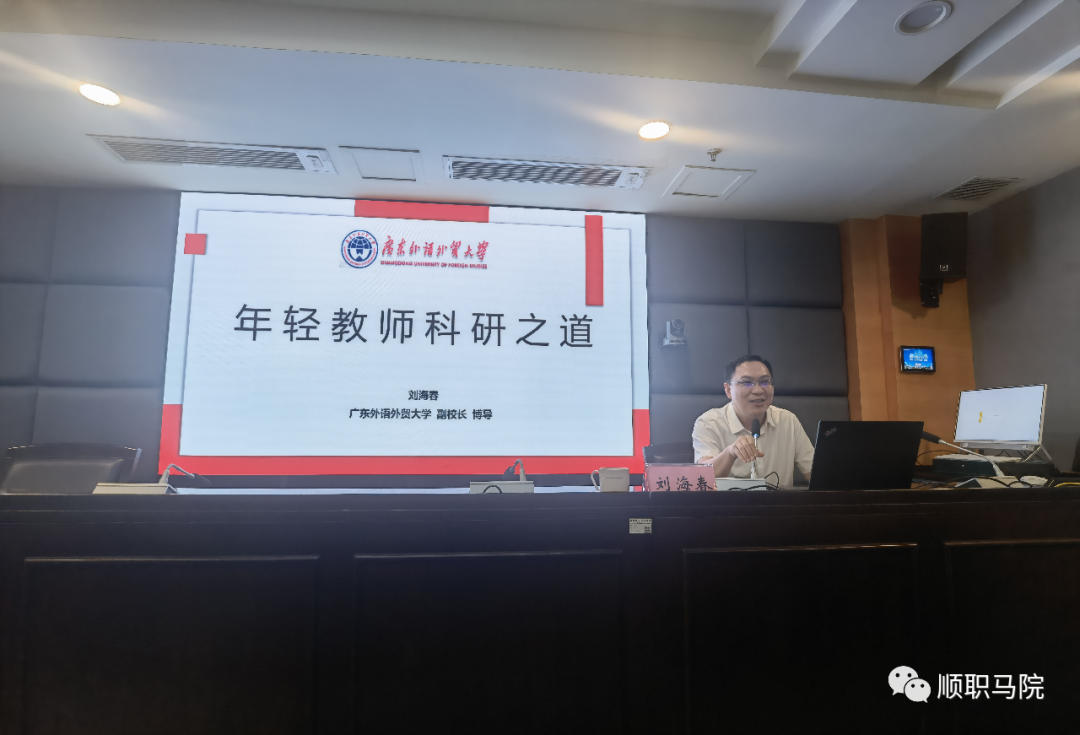 6月7日,由学校教师发展中心、科技处及马克思主义学院教师发展中心共同举办的青年教师科研培训讲座(第七期“尚贤讲堂”)在行政楼507会议室开展。本次讲座邀请了广东外语外贸大学党委常委、副校长刘海春教授作“年轻教师的科研之道”主题分享,学校职能部门和各二级学院青年教师代表共40余人参加讲座。讲座由马克思主义学院副院长肖薇薇主持。