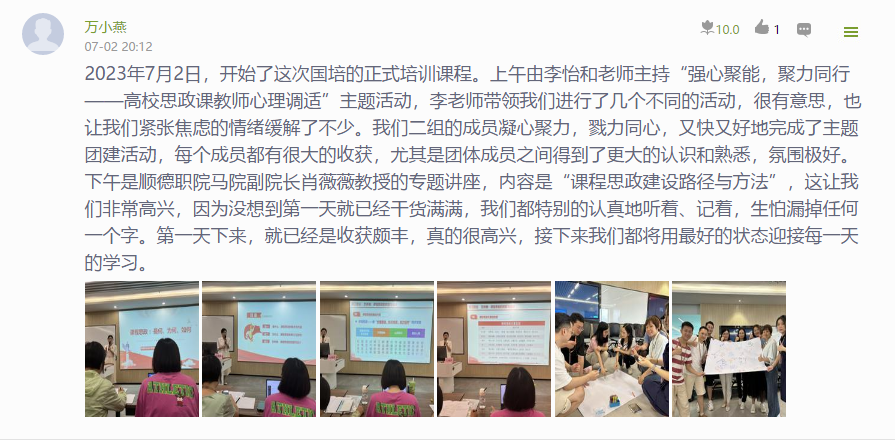 2023年7月2日上午,顺德职业技术学院马克思主义学院李怡和老师在图书馆6楼多功能室为40位学员开展主题为“强心聚能,聚力同行——高校思政课教师心理调适”的团体辅导。她通过热身活动帮助学员去除陌生感,尽快融入团队;在主题活动阶段,她从“关系、沟通、信任”三个方面帮助学员尽快适应身份转变,做到有效沟通,并在团队中培养彼此之间的信任,确立团队成员“不否定、不对抗、不评判”的原则,以期建立一个有效支持、共同成长的团队。在分享总结阶段,学员表示通过团体辅导,深切体会到了“共情”与“被关注”的力量,团队成员之间逐渐建立良好关系,为后续的团队学习和合作打下坚实基础。