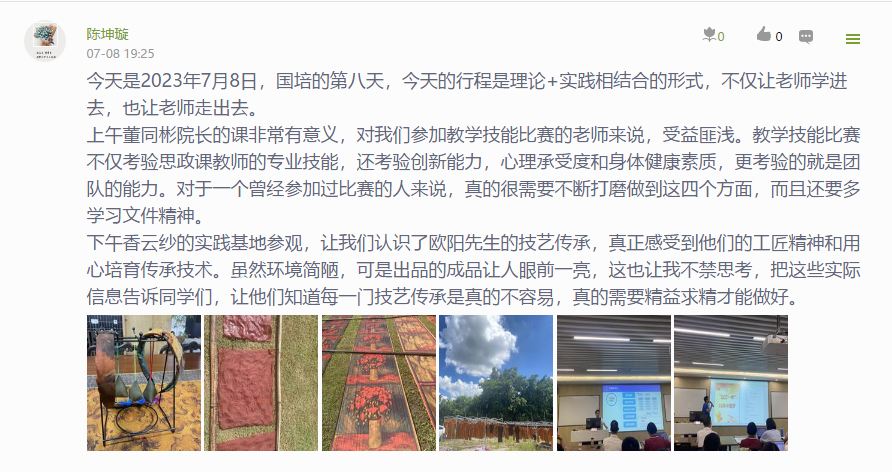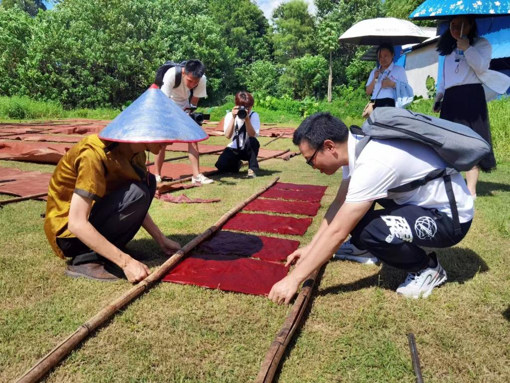 下午,学员们前往国家非物质文化遗产香云纱基地参观研修。唐贤香云纱文化馆馆长、广东唐贤服饰有限公司、广东顺德凤舞寰宇香云纱文化传播有限公司联合创始人、香云纱非遗传承人欧阳永泽先生为学员们详细讲解了“香云纱”及香云纱的染整技艺和传承现状。学员们怀着极大的好奇和热情参观了香云纱基地,并在欧阳先生的带领下学习染整技艺,切身感受非遗文化的魅力。通过本次香云纱基地参观研修活动,极大激发了学员们对“非遗香云纱文化”传承与保护的兴趣,可以为国家非物质文化遗产注入鲜活生命力。
