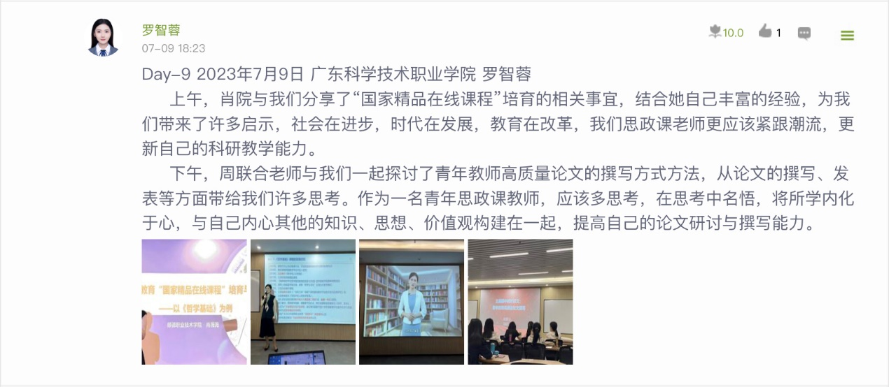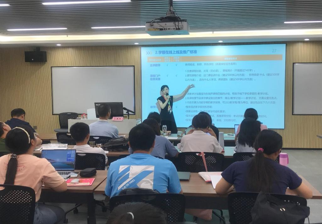 7月9日上午,马克思主义学院副院长肖薇薇教授以我校《哲学基础》课程为例,与学员分享了职业教育“国家精品在线课程”培育与申报的心得。《哲学基础》自2007年作为我校公共必修课开设以来,通过建设课程网络平台、撰写自编教材和筹备课程资源库等努力,广受学生好评和认可,先后被评定为广东省精品在线开放课程、国家级精品在线开放课程,获得2022年广东省高等职业教育“课堂革命”典型案例认定,并被推送参加广东省思政教育案例认定。肖薇薇教授从政策解读、建设意义、建设培育和申报技巧四个方面切入,带领学员从解读申报文件开始详细梳理了整个申报流程,并总结概括出申报的“四精标准”:精准规划课程建设、精致建设课程内容、精益管理课程运营和精美准备课程申报。肖薇薇教授的分享内容丰富充实,学员们纷纷表示开拓了视野,对课程建设的广度、深度都有了新的认识。