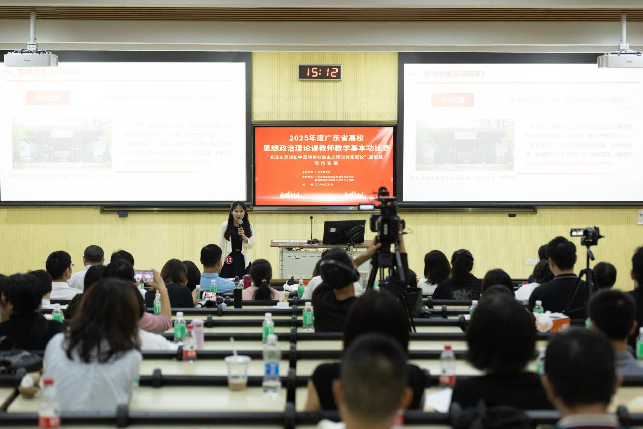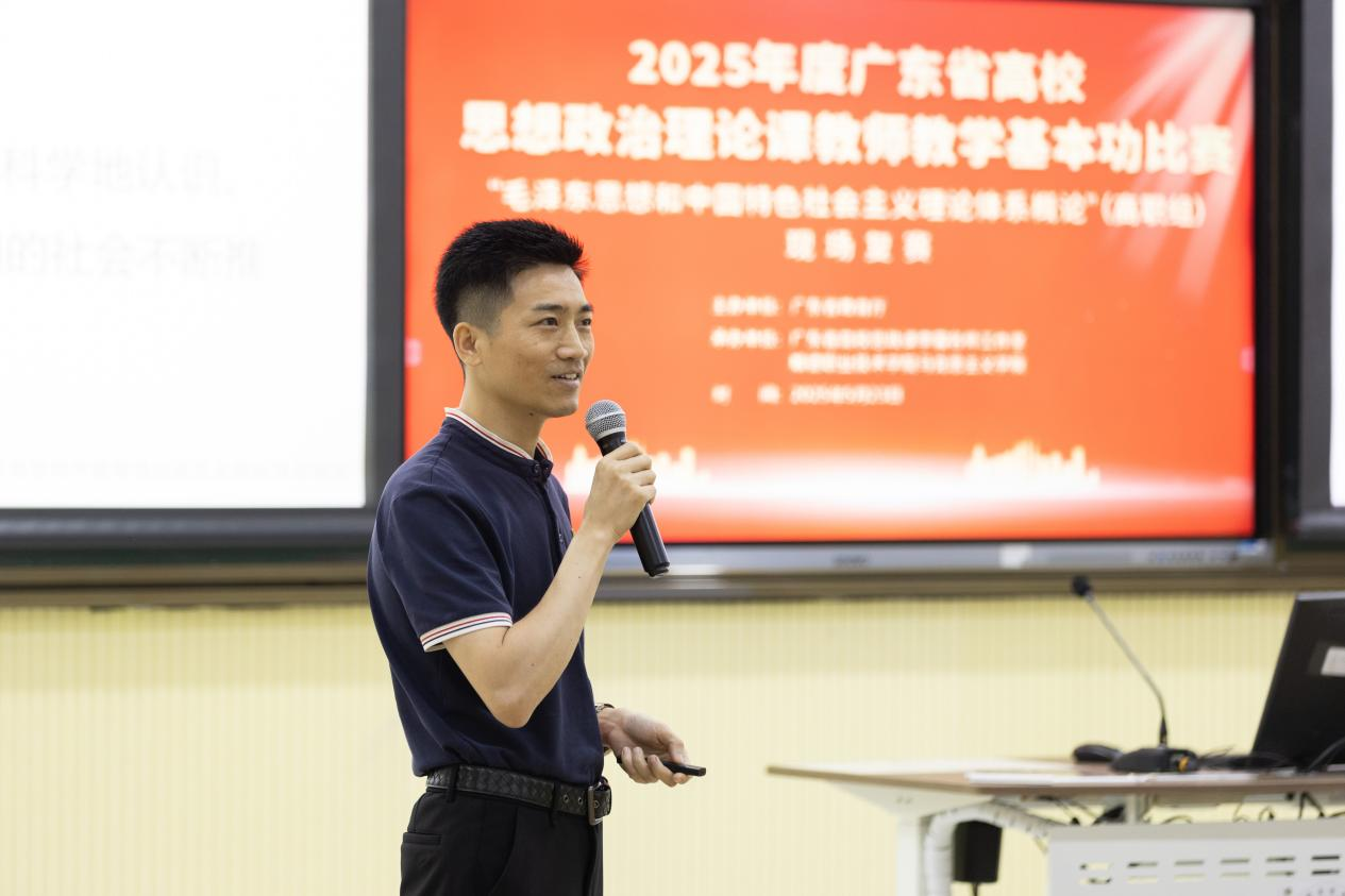 本次比赛由广东省教育厅主办,包括初赛、录像评审、现场复赛和决赛四个环节。初赛由各高校自行组织;在各高校推荐的基础上,2025年4月底,广东省高校思政课李霞名师工作室组织了“毛概”课参赛录像材料的评审工作,遴选了14位选手进入现场复赛。根据复赛规则,提前2小时由选手随机抽取“毛概”(2023版)教材中的任意一章,进行15分钟的现场授课和5分钟答辩。最后,根据各评委打分情况,推选选手进入决赛。本次复赛历时一天,紧张激烈、精彩纷呈,充分展现了我省高职院校思政课教师良好的政治素养、扎实的理论功底和娴熟的教学技艺。