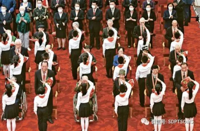 2021年6月29日,庆祝中国共产党成立100周年“七一勋章”颁授仪式在北京人民大会堂金色大厅隆重举行。这是少先队员向勋章获得者献花,敬礼致意。新华社记者 高洁/摄