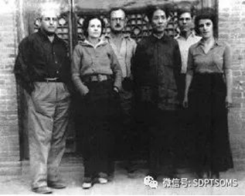 1937年,托马斯·亚瑟·毕森和朋友们到访延安。左起:菲立浦·贾菲、佩吉·斯诺(尼姆·威尔斯)、欧文·拉铁摩尔、毛泽东、毕森、艾格尼丝·贾菲