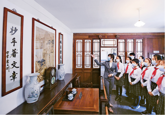 李大钊同志是中国共产主义运动的先驱,伟大的马克思主义者,杰出的无产阶级革命家,中国共产党的主要创始人之一。1920年春至1924年1月,李大钊和妻儿曾在北京市西城区文华胡同24号生活了近4年。中国共产党百年华诞之际,李大钊故居经过改造提升后重新对外开放。图为讲解员为前来参观的学生做介绍。新华社记者 张晨霖/摄