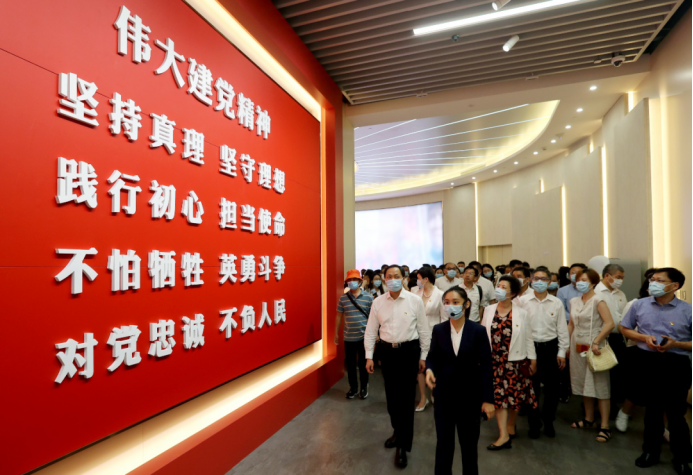 2021年7月23日,观众在中共一大纪念馆观看新近增设的“伟大建党精神”展陈。新华社记者 刘颖/摄